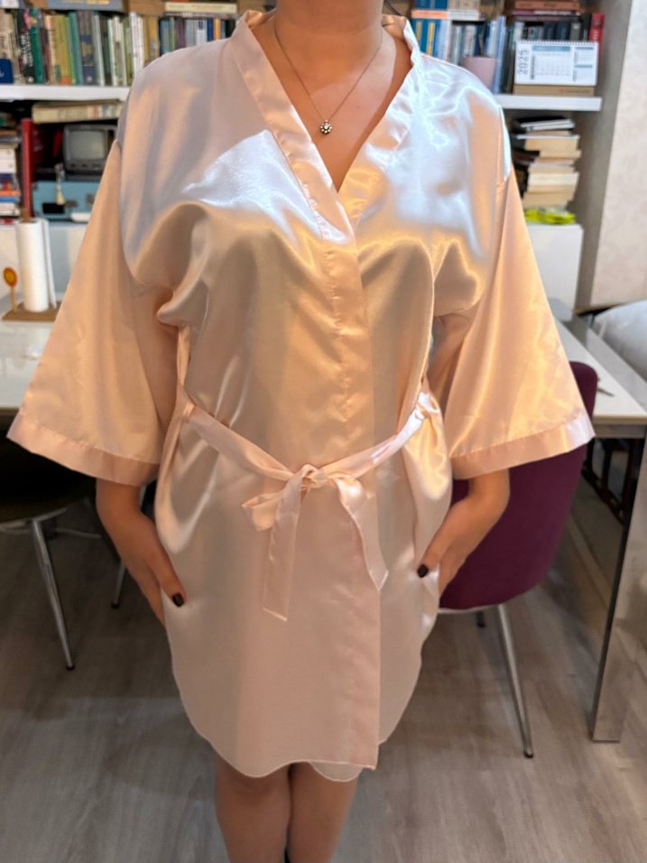 Rahat kesim, kısa kollu, midi boy bej sabahlık. Pastel tonlarda, desensiz ve belden bağlamalıdır. Bohem Paris tarzı yansıtır. ️