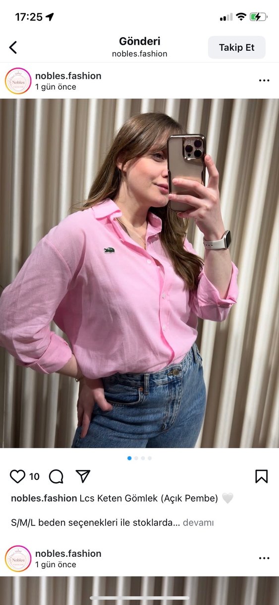 Açık pembe tonunda, düğmeli ve V yakalı, bol kesim uzun kollu denim gömlek, günlük sokak stiline uygundur.