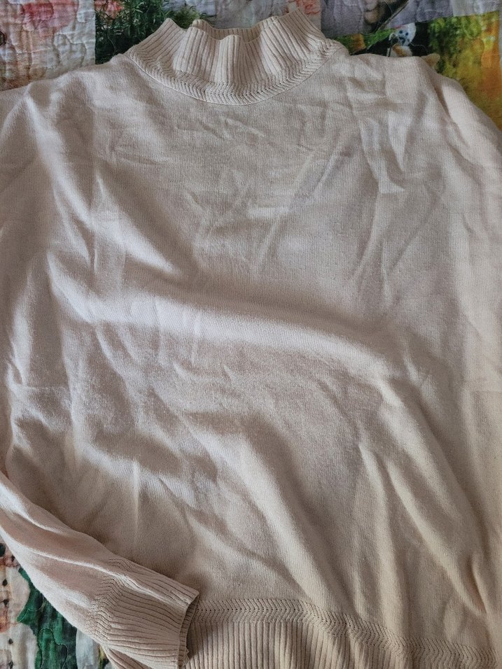 Açık pembe keten kumaştan, balıkçı yaka ve uzun kollu, bol kesim kadın kazak, gündelik kullanıma uygun rahat ve sade bir tarz sunar.