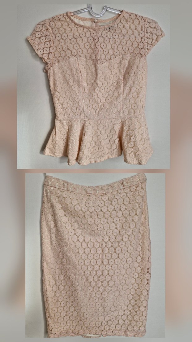 Açık pembe renkte, dantelden yapılmış, kısa kollu ve yuvarlak yakalı, vücuda oturan midi uzunlukta bluz etek takım. Minimalist ve retro tarzı yansıtır. İthal üründür, hiç kullanılmadı.