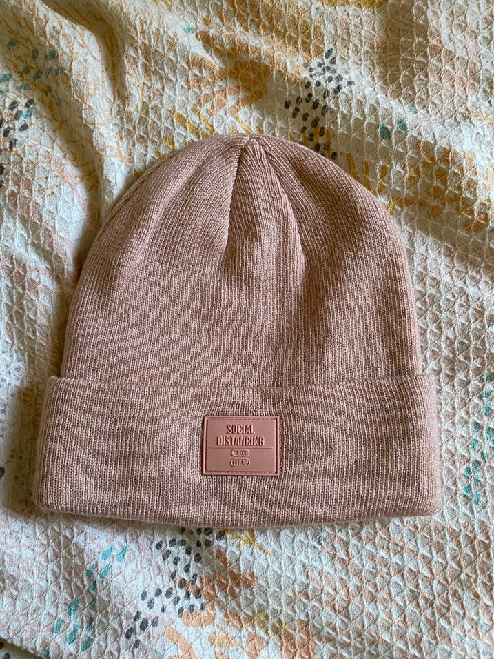 Yumuşak örgüden yapılmış açık pembe renk kadın bere, sade ve rahat sokak stili, pastel tonlarda.