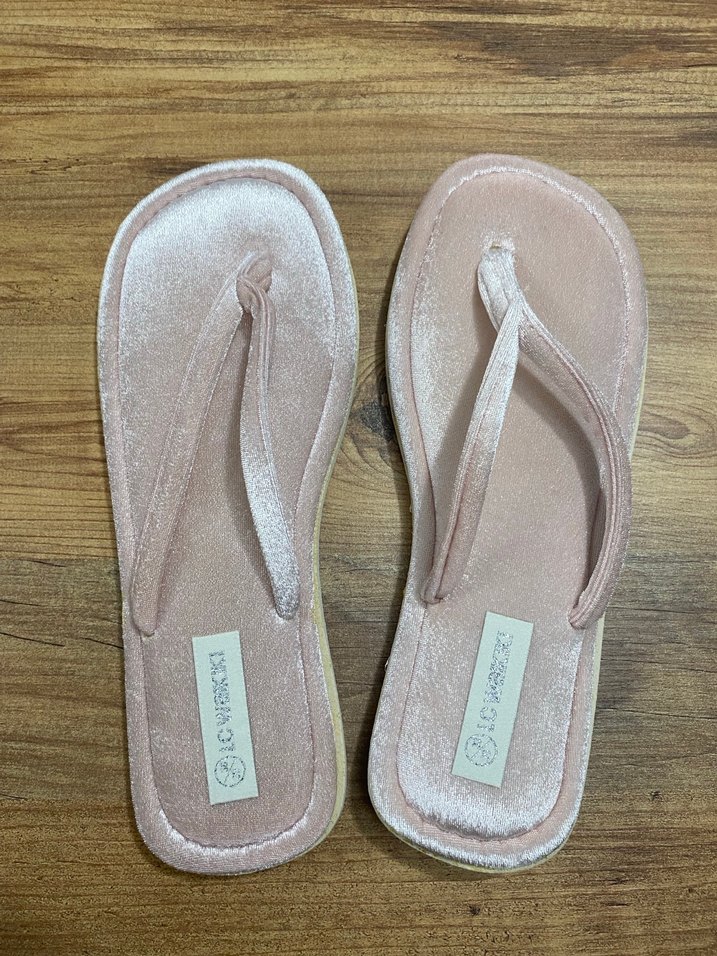 Açık pembe renkte, sade desensiz kadın ev terlikleri. Yumuşak kauçuk malzeme ile günlük kullanım için rahat ve şık. Ürün hiç kullanılmadı 38-39 numara