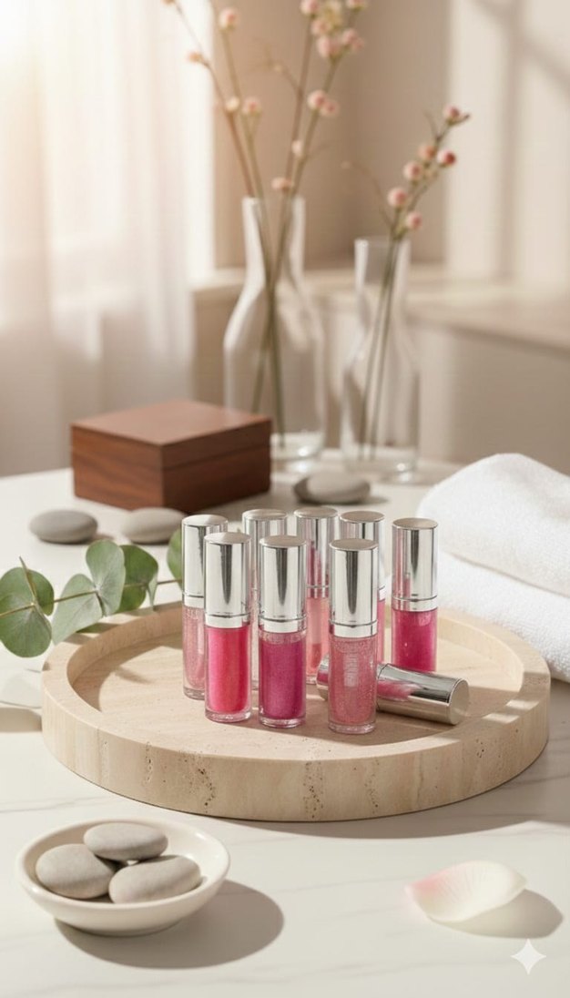 Parlak gümüş kapaklı, açık pembe tonlarında ruj seti. Dudaklara hafif renk katmak için uygundur.