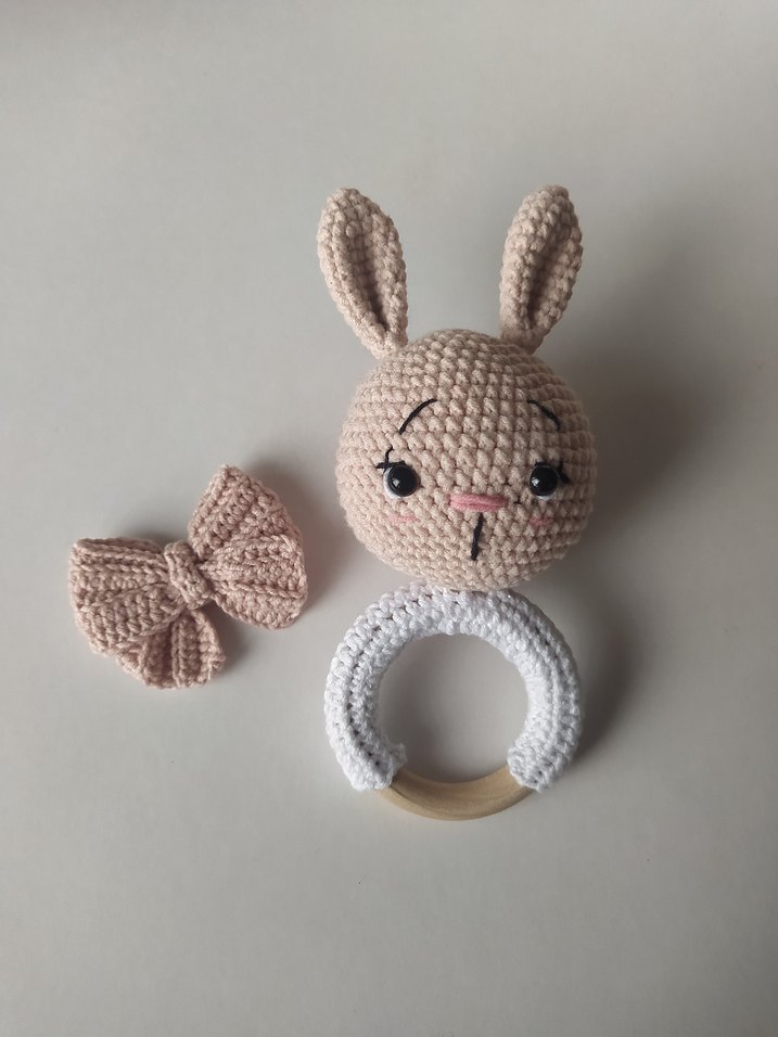 Pastel pembe renkte, ahşap halkalı örgü tavşan şeklinde diş kaşıyıcı ve çıngırak Ürün boyu 17 cm Coton iple örülmüştür 0 üründür Toplu alımlar için lütfen mesaj atınız #çıngırak #süs #aksesuar #pembe #örgü #bebek