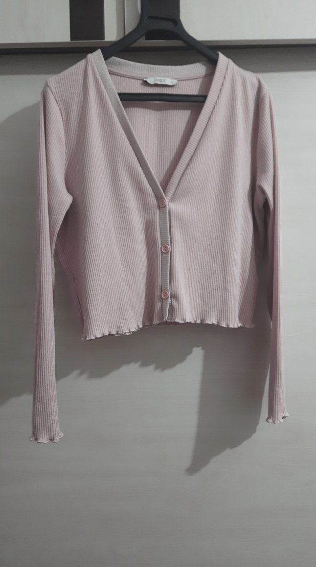Pastel pembe renkte, düğmeli, V yakalı uzun kollu kadın hırkası. Rahat kesim ve midi boyda,simli esnek triko kumaştan üretilmiştir. Minimalist ve trendi günlük tarz için uygundur. 38 44 uyumludur