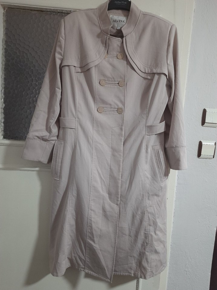 Pudra renkli, yumusak kumas keten kumaştan uzun düğmeli trençkot. Strappy kollu, klasik yakalı ve ofis kullanımı için uygun modern tasarım. resimdeki görüldüğü gibi içine gelecek kısımda iki tane hafif leke vardır giyildigi zaman gorulmeyen kısmında ve bir tane düğmesi eksiktir o yüzden uyguna veriliyor.