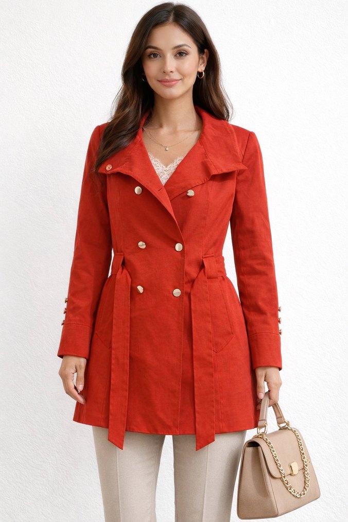 Rengi fotoğraftakinden açık nar çiçeği diye geçiyor böyle ciyak değil midi trençkot, düğmeli ve kesimli yakaya sahip. Uzun kollu, ve desen içermeyen kumaşıyla günlük kullanıma uygundur. M beden uyumlu