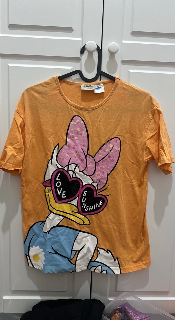 Sarı, kısa kollu, baskılı kız çocuk tişörtü. Sentetik kumaştan, rahat kesim, günlük kullanıma uygun.