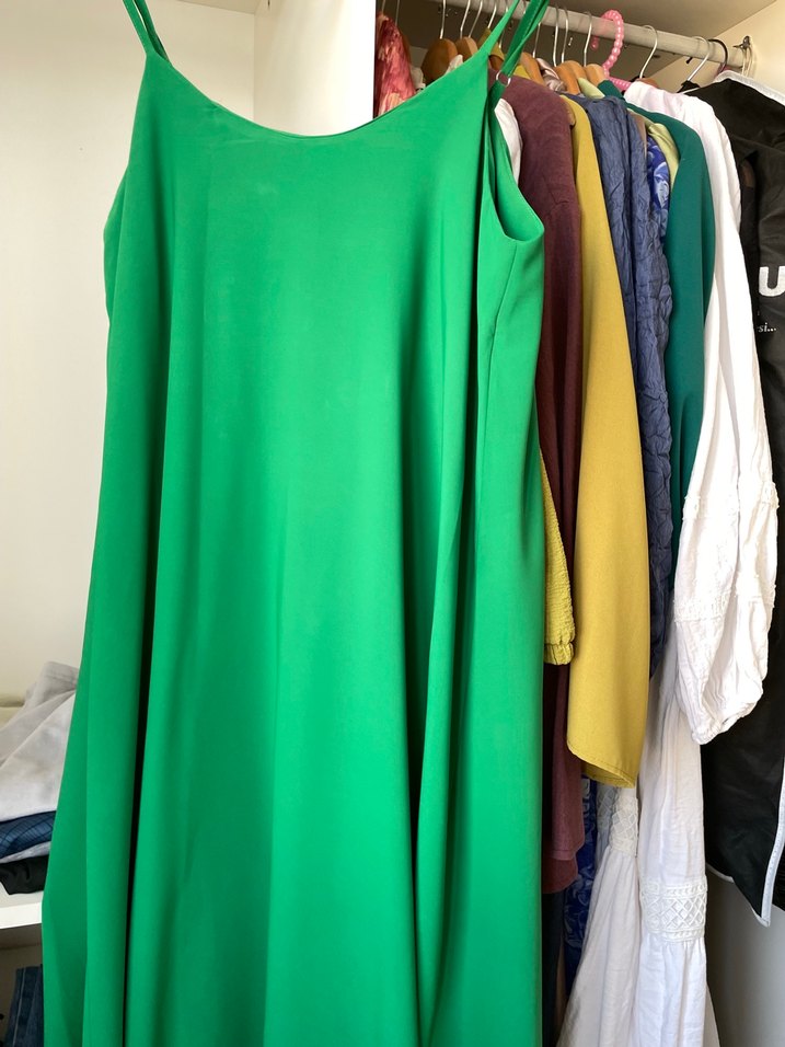 İnce askılı ve düzgün dokulu açık yeşil elbise, dolapta diğer giysilerle birlikte asılıdır.