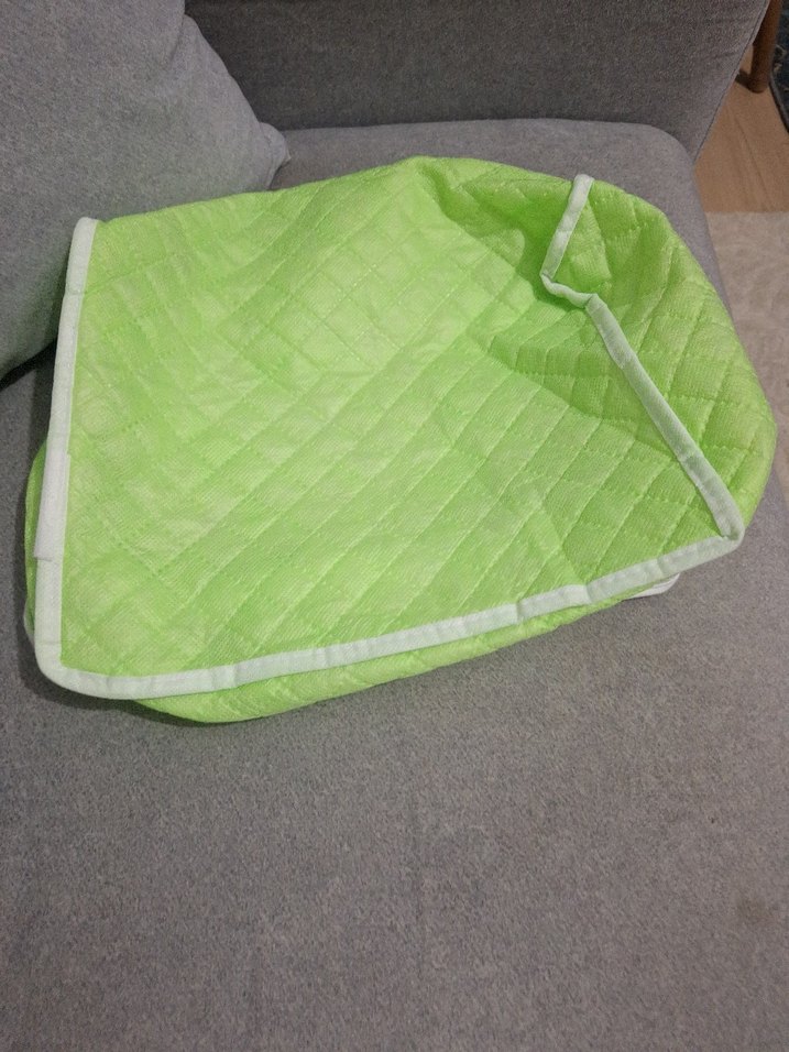 Açık yeşil, düz desensiz ve beyaz kenarlıklı yatak örtüsü. Yumuşak dokulu, yatak odası için uygun. ️