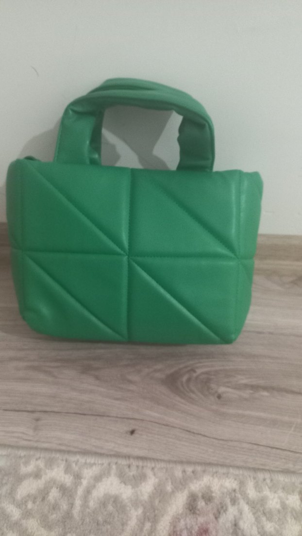 Açık yeşil, desenli kadın çantası. Minimalist ve çağdaş tarzda, günlük kullanım için uygundur.
