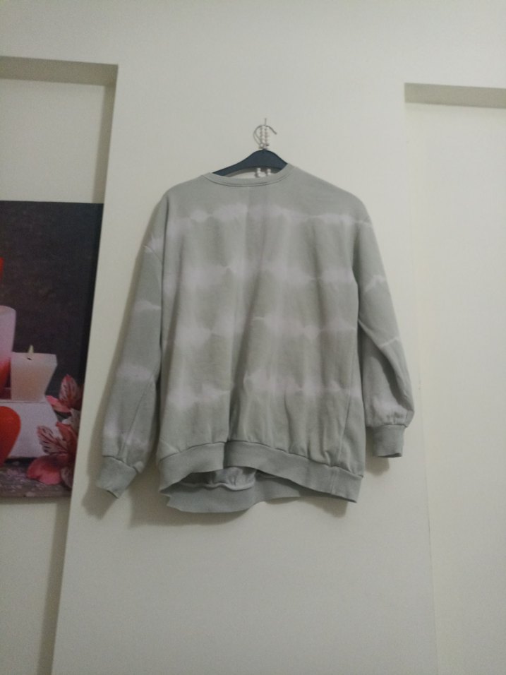 açık yeşil uzun kollu, yuvarlak yakalı ve bol kesim kadın sweatshirtü. Rahat sokak stili için uygundur.