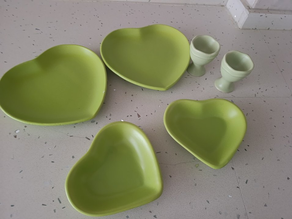 Açık yeşil renkte, kalp şekilli, desen içermeyen tabaklardan oluşan sade ve şık bir tabak seti. ️