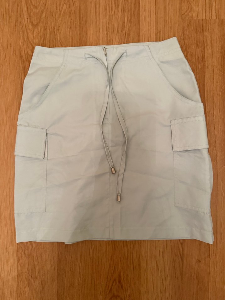 açık yeşil keten mini etek, kemerli ve rahat kesim, cepli ve fermuarla defosuz hiç giyilmemiş etek
