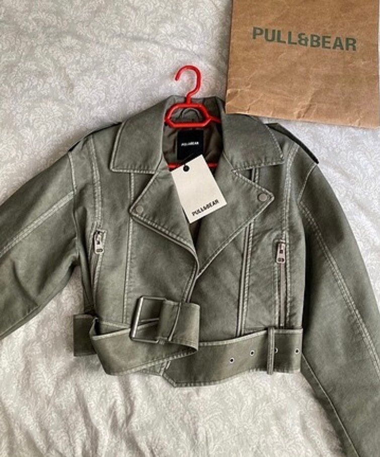 PULL&BEAR marka, yeşil mini süet kumaştan, kemerli, kısa kesim, dar kesim kadın deri ceket. Notch yaka ve askılı kollarla günlük kullanıma uygun.