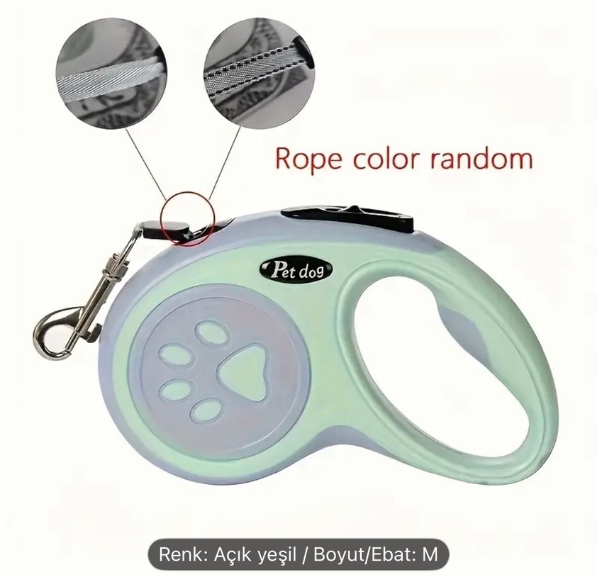Ergonomik saplı, otomatik geri çekilebilir ipli açık yeşil köpek tasması. Boyut M, evcil hayvanlar için uygundur.