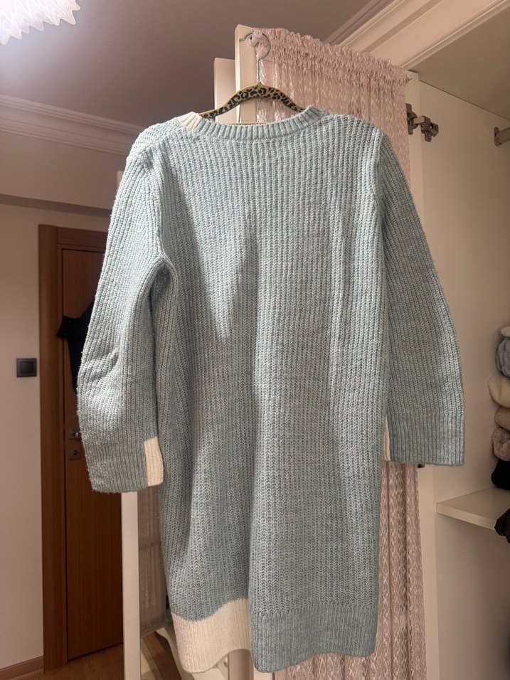 cok acik yesil renkte, uzun kollu ve bol kesim triko kadın kazak. Uzun boyu ve yuvarlak yaka detayı ile rahat ve günlük kullanıma uygun.