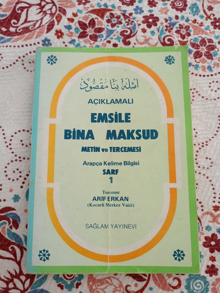 Arapça kelime bilgisi ve Sarf konularını içeren, Arif Erkan tarafından tercüme edilmiş Açıklamalı Emsile Bina Maksud kitabı. Sağlam Yayınevi yayımladı.