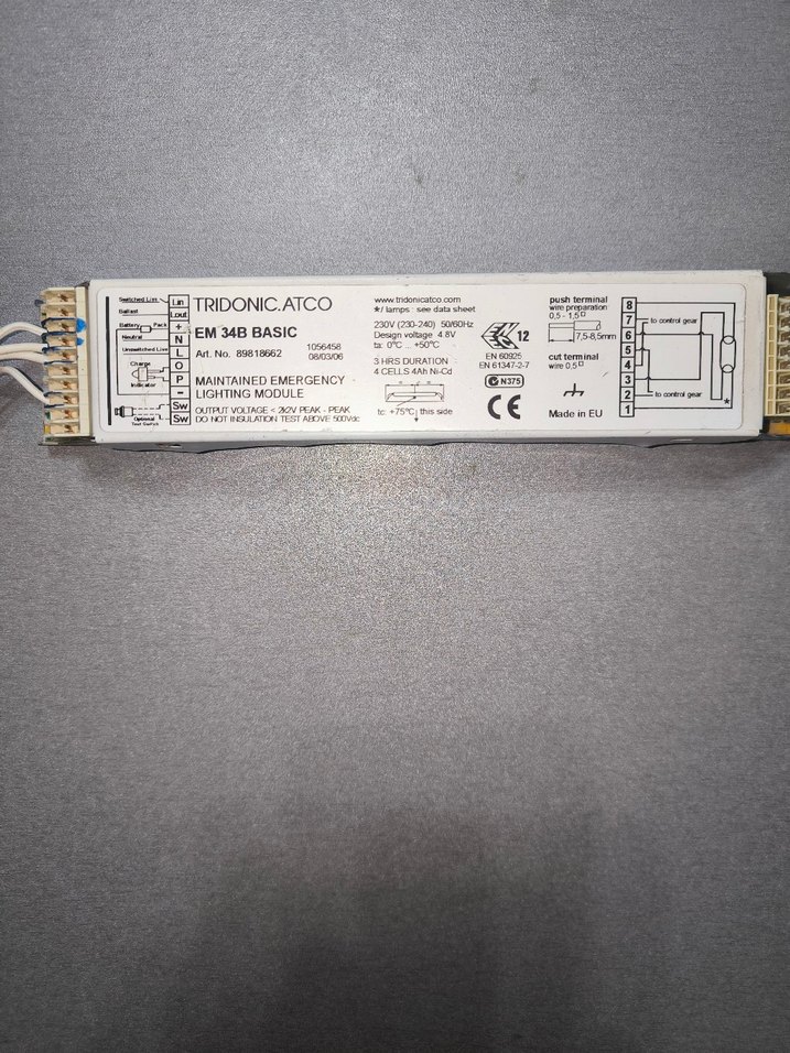Tridonic ATCO EM 34B BASIC acil aydınlatma modülüdür. 4 hücre 4Ah Ni-Cd batarya ile çalışır. Floresan lambalar için uygundur.