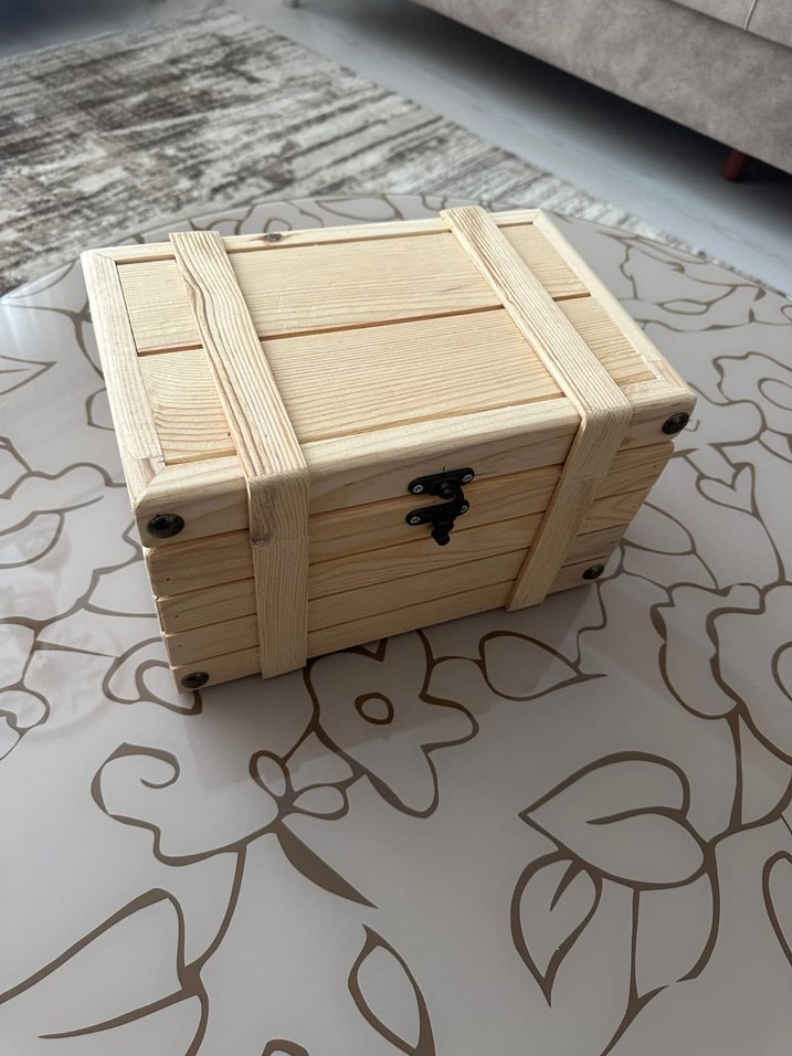 Açılabilen kapaklı, açık bej renkli ahşap oyuncak kutusu.
