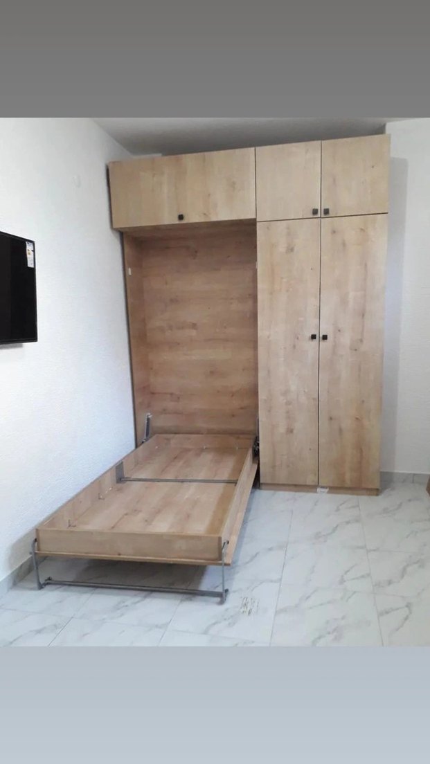 Bej renkte, açılabilir yataklı, açık ahşap dokulu çocuk dolabı. Pratik depolama ve yatak alanı sunar. ️