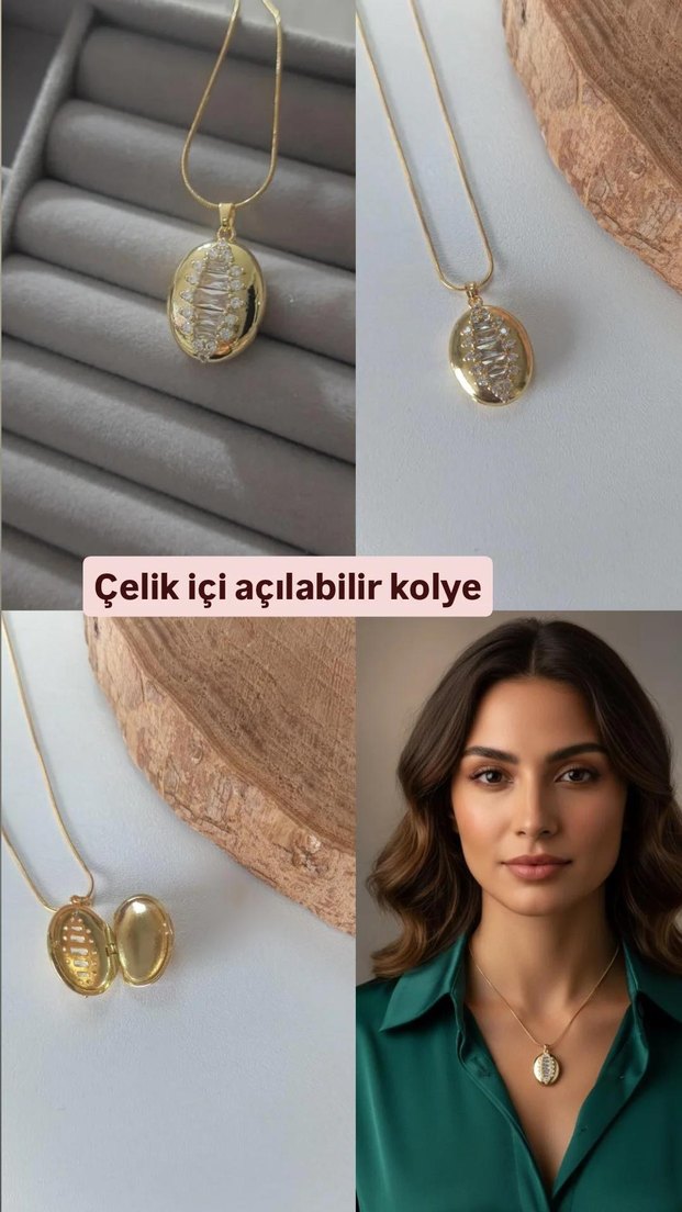 Bej renginde, şeffaf ve minimal tasarımlı, açılabilir çelik iç yapıya sahip kolye, günlük kullanıma uygundur. ✨