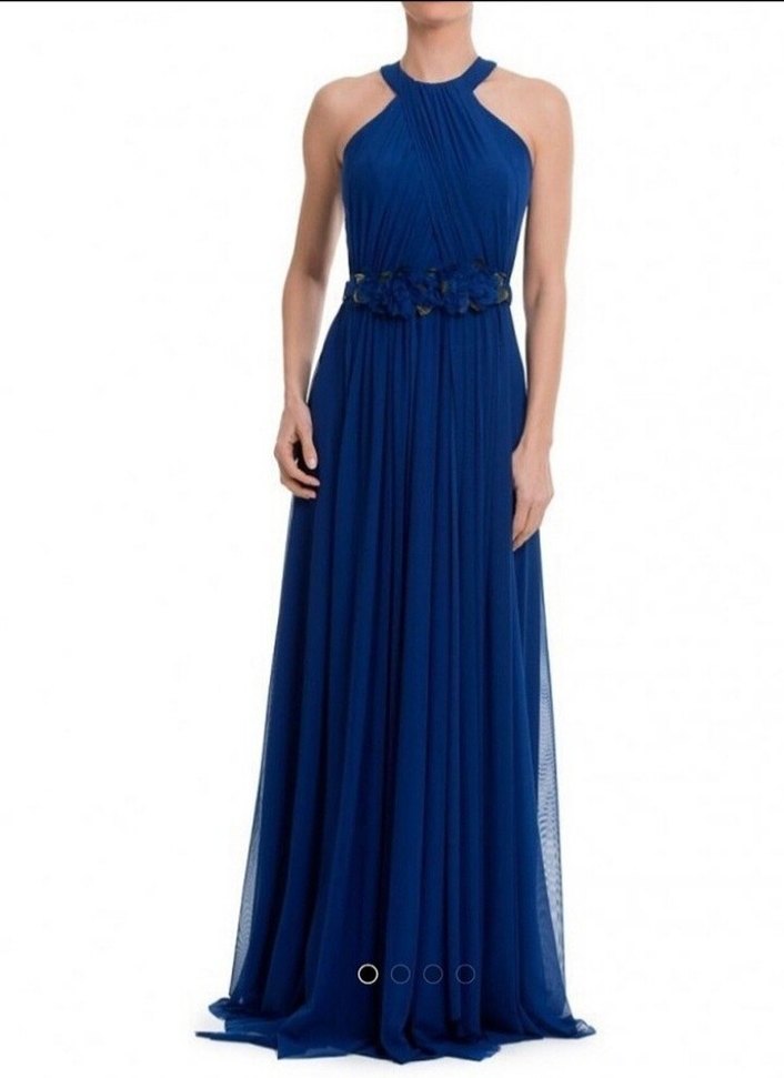 Lacivert uzun abiye elbise, yüksek yaka ve kolsuz tasarıma sahiptir. Belden kemerli, vücuda oturan kesimiyle modern klasik şıklık sunar. zariftir.