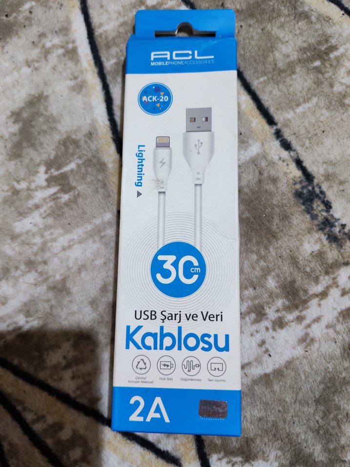 ACK-20 modeli 30 cm uzunluğunda, 2A şarj ve veri aktarımı sağlayan beyaz Lightning USB kablosudur. Hızlı ve güvenilir bağlantı sunar. ⚡