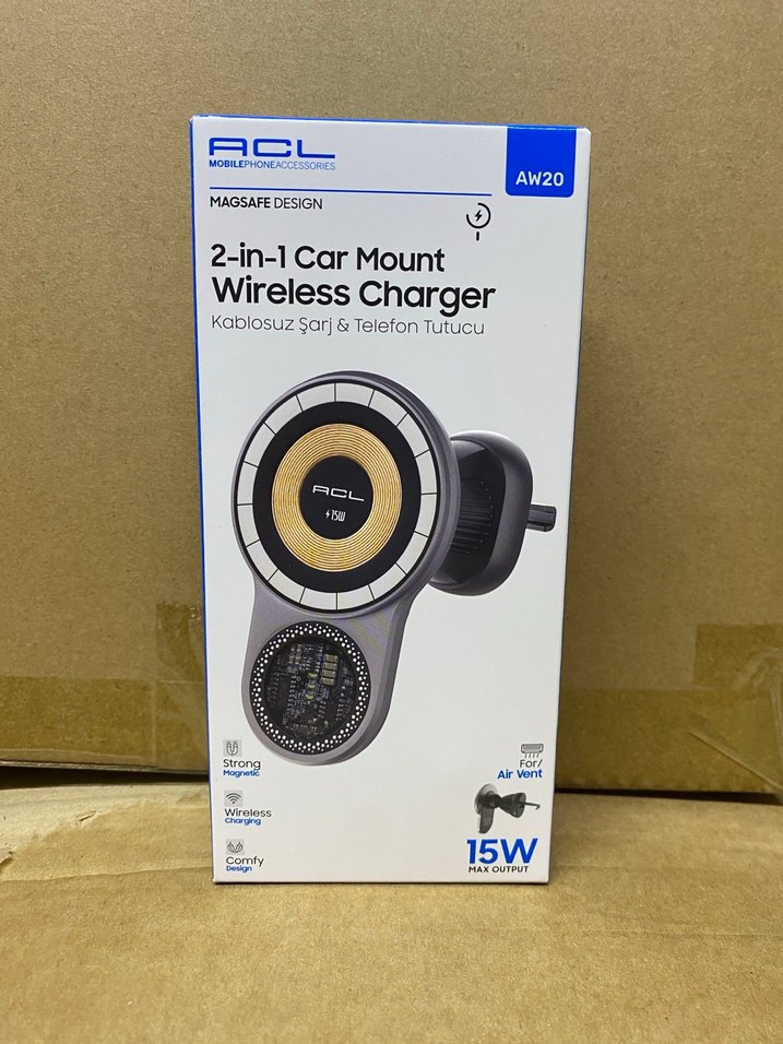 ACL AW20, 15W kablosuz şarj ve araç içi telefon tutucu olarak camel ve gri renklerde, hava menfezine takılır. Güçlü manyetik tutuş ve konfor sağlar.