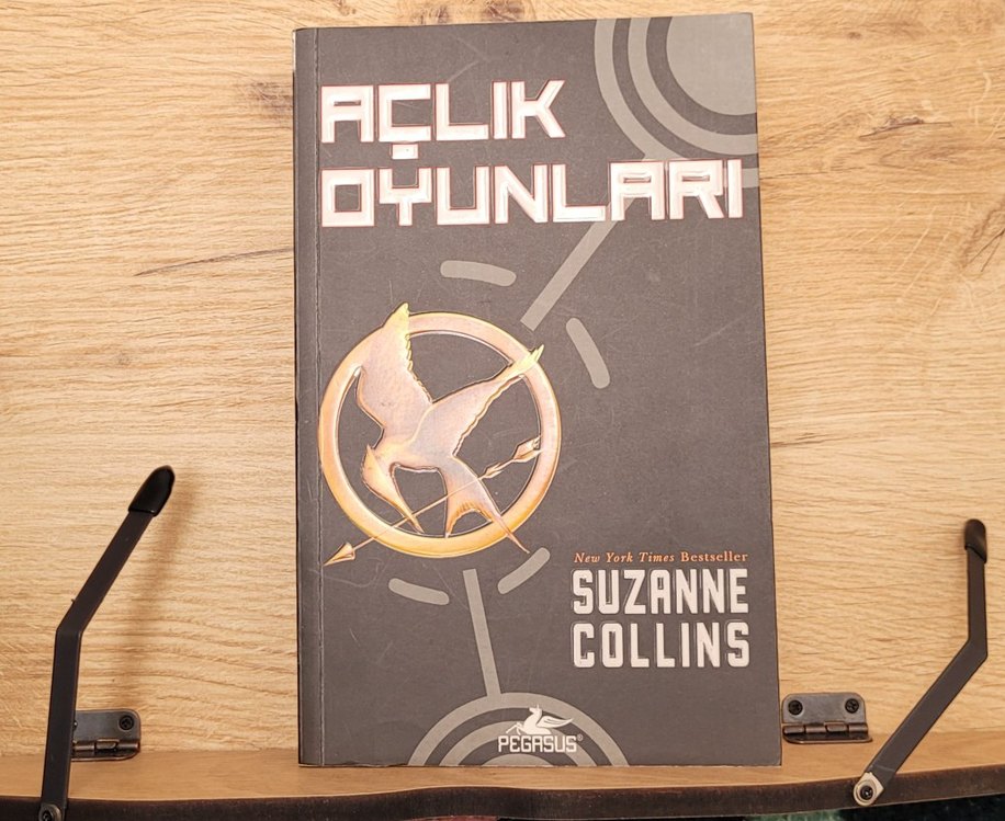ilk sayfada yazı var onun dışında temiz kitap Suzanne Collins'in Pegasus tarafından yayımlanan ve New York Times bestseller listesinde yer alan "Açlık Oyunları" romanı, dikkat çekici bir alaycı kuş sembolü kapağına sahiptir.