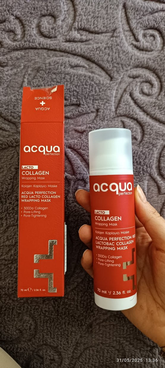 Acqua Perfection Lacto Collagen Wrapping Mask, 300Da kolajen içerir, gözenekleri sıkılaştırır ve lifting etkisi sağlar. 70 ml şişede sunulur. ürün bir kere kullandı temiz dokudur şefaflasan maske