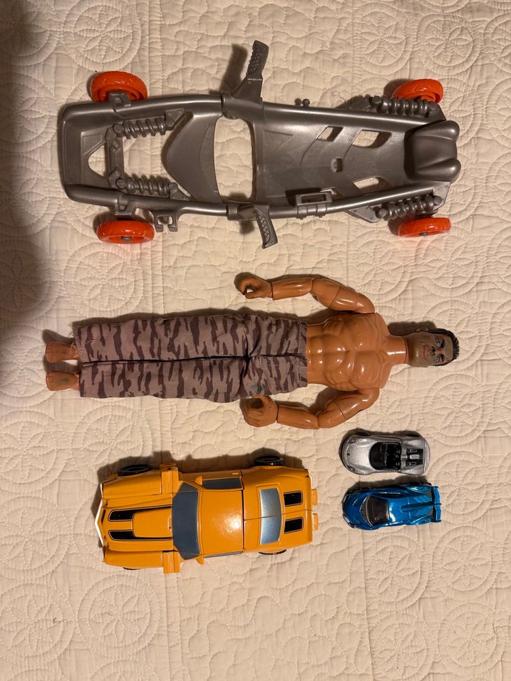 hepsi sorunsuzdur sadece bumbellbee fotoğraflarda belirtildiği gibi sağ kol oynar kısmı ufak sorunludur takılınca duruyor sergilenebilir ama oynanması zordur rahat bir şekilde araba olabiliyor arabalar ve action man figürü görüldüğü gibidir sıkjntısız action manin kafasında kalemle çizimler vardır. fiyat hepsi için topludur uygundur PAZARLIK PAYI VARDIR