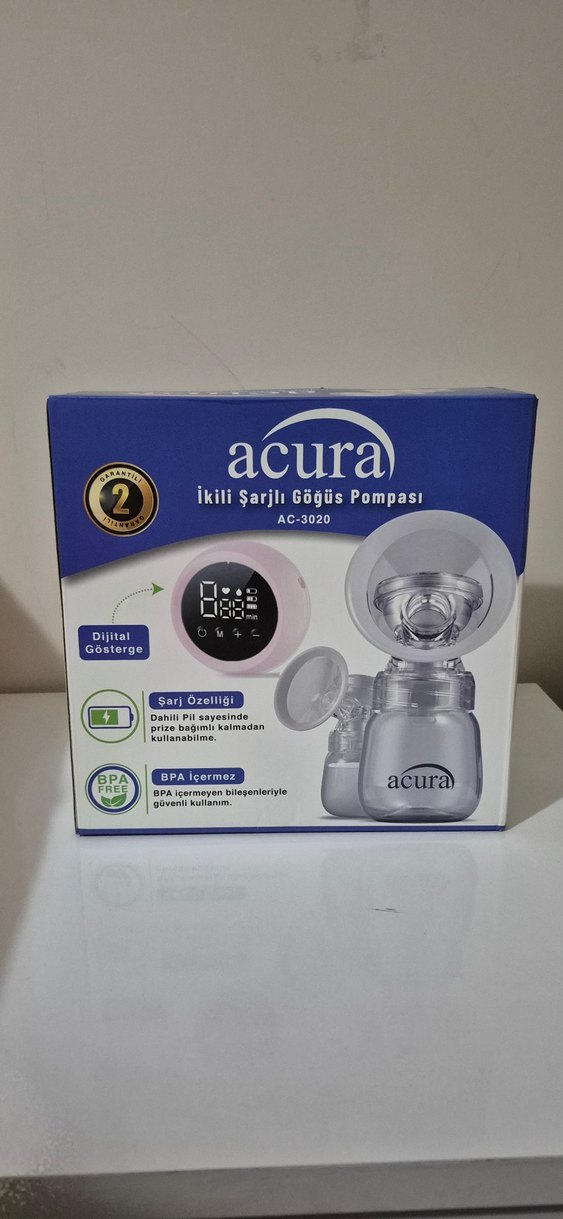 Ürün Bilgisi: Adı: ACURA AC-3020 Şarjlı, LCD Ekranlı, Biberon Özellikli Çiftli Göğüs Pompası, Güç: 5V-1A Pil Kapasitesi: 1200mAh Şişe Hacmi: 10ml Kontrol Ünitesi: LCD Ekran Malzeme: Gıda Sınıfı Silikon ( BPA İçermez ) Renk: Pembe Ürün Özellikleri: 1- Masaj ve Masaj + Sağım Modu, 9 farklı seviye ile herkese hitap eden bir sağım kalitesi. 2- Kompakt ve taşıması kolay. 3- LCD Ekran 4- Sessiz yapısıyla her yerde istediğiniz gibi kullanın. 5- Biberon olarak kullanabilme özelliği. 6- Ana ünite harici sıcak su ile dezenfekte edilebilir. 7- USB kablo ile özgürce şarj edebilme özelliği. Paket İçeriği: 1- ACURA AC-3020 Şarjlı, LCD Ekranlı, Biberon Özellikli Çiftli Göğüs Pompası 2- Süt Yolu (2 Adet) 3- Şişe (2 Adet) 4- Biberon Aparatı 5- Hava Hortumu (2 Adet) 6- Duckbill Valf (2 Adet) 7- USB Kablo 8- Kullanım Kılavuzu Ürün az kullanilmis yeni gibidir, ikili olmasina ragmen sadece bir setini acip bir kac kere kullandim, cok temiz ve kullanisli bir üründür. Alacak olanlara simdiden hayirli olsun.