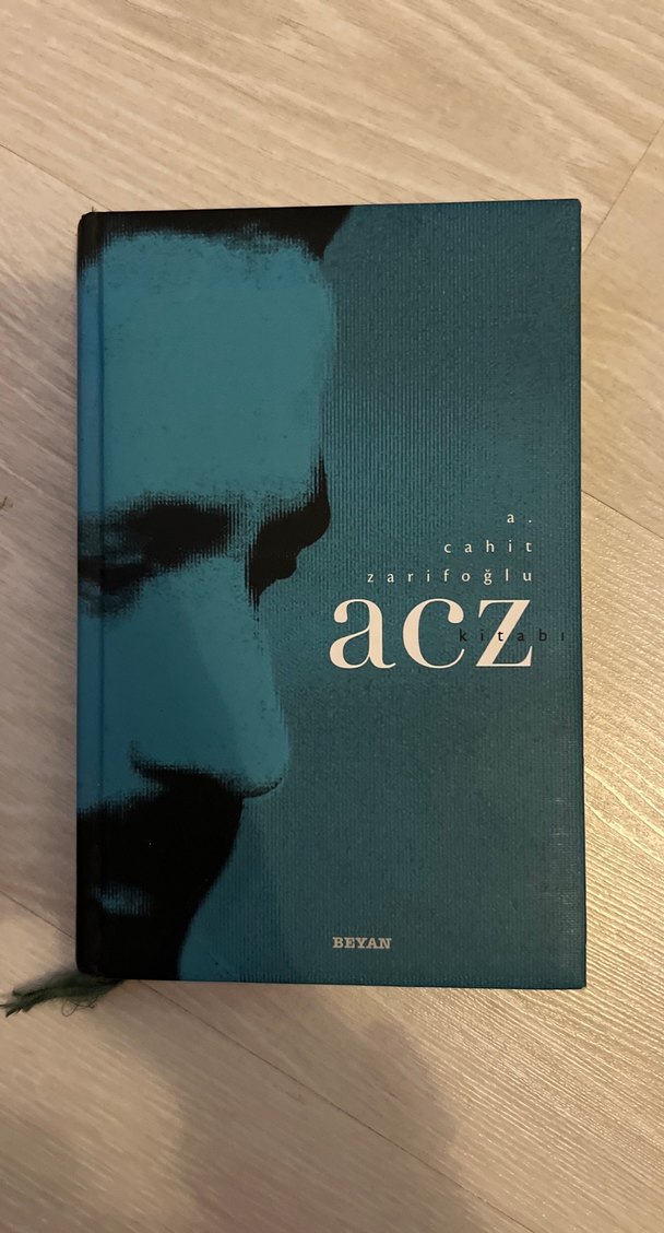 A. Cahit Zarifoğlu'nun Beyan yayınevinden çıkan 'Acz' romanı, koyu tonlarda yakın çekim bir portre kapak tasarımına sahip.
