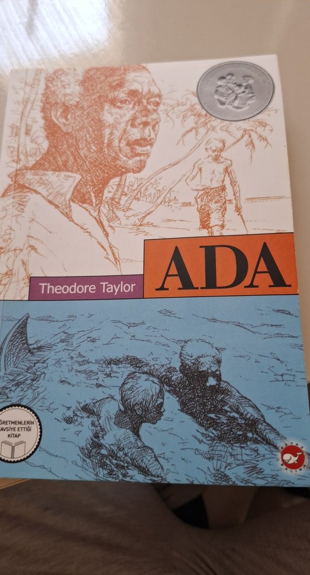 Theodore Taylor'ın "ADA" adlı romanı, karakterleri ve temalarıyla derin bir hikaye sunar. Kapakta deniz kenarında bir sahne ve portre yer alır.