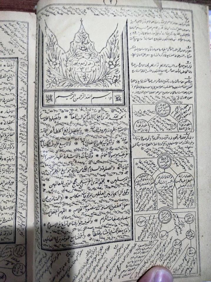 Adalı Cedîd ale'l-izhar El yazması dini kitap, detaylı kaligrafi ve karmaşık diyagramlar içerir. Sayfalarda süslü tasarımlar ve geleneksel yazı stili bulunur.