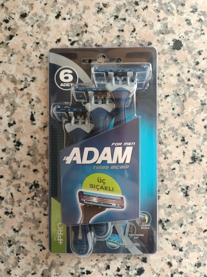 Adam erkek tıraş bıçağı seti, üç bıçaklı 6 adet koyu mavi tıraş bıçağı içerir. Kullanımı kolay ve etkili tıraş sağlar.