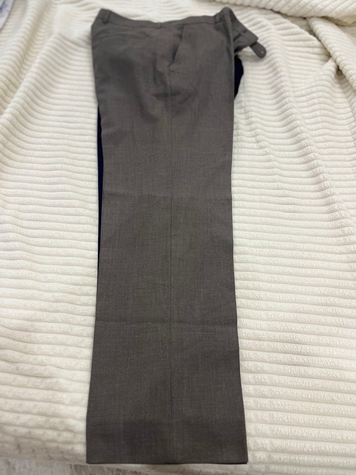 Gri renkte, kemerli ve düz desensiz adam kumaş pantolon. Ofis için uygun, sentetik ve rahat kumaştan üretilmiştir.