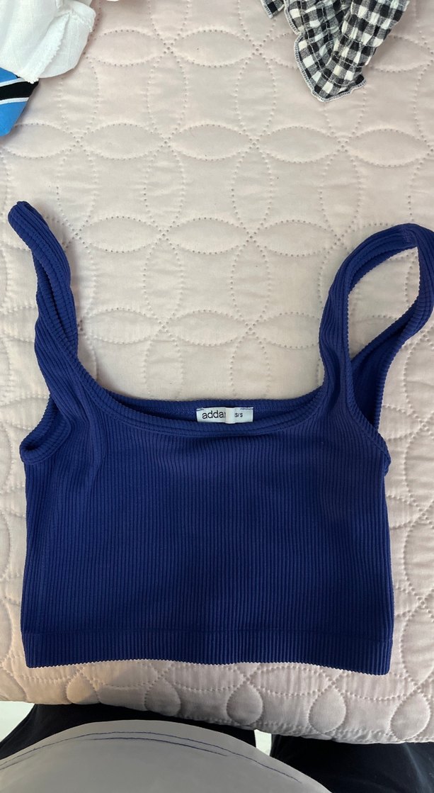 Adda markalı, lacivert renkli, örme yapıda, ince ve esnek sentetik kumaştan yapılmış, kolsuz, tek renk, dar kesim crop top.