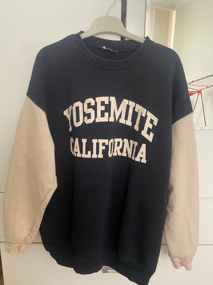 uzun kollu ve bol kesim olan bu sweatshirtte "YOSEMITE CALIFORNIA" baskısı bulunur. Bol kesim