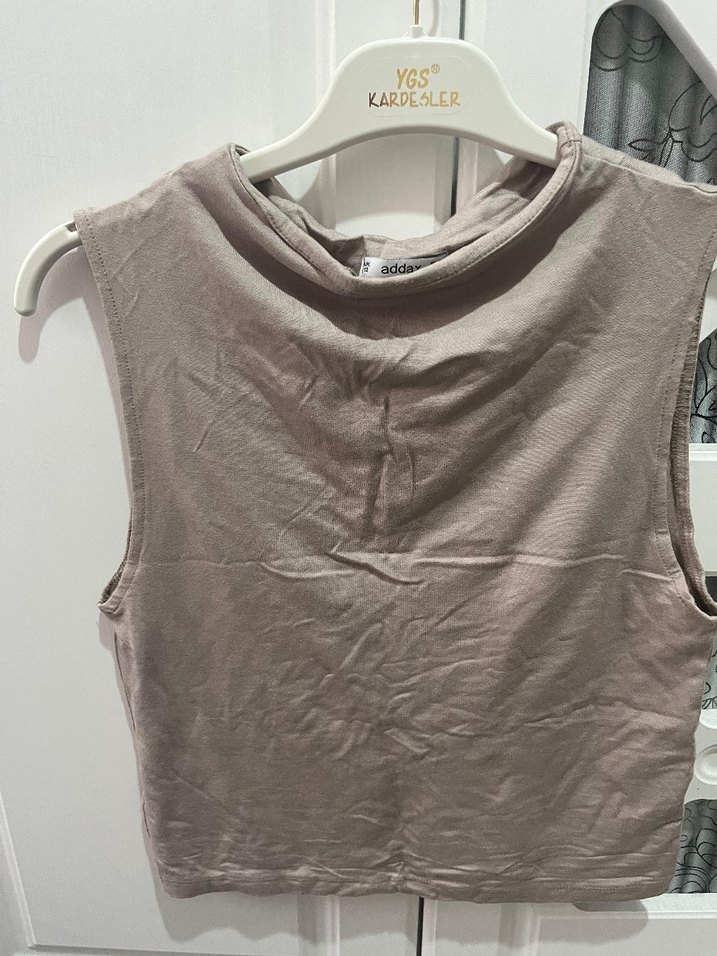 Bej renkli, keten kumaştan, kolsuz ve yüksek yakalı mini kadın atlet. Üzerinde "KARDESLER" yazısı bulunur. Günlük sokak stili için uygun.
