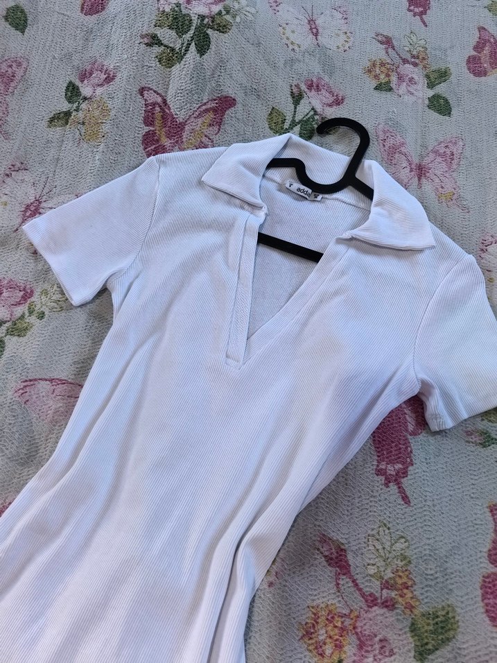 V yaka ve kısa kollu, pamuklu kumaştan yapılmış beyaz midi elbise. 36 beden, sadece youtube videosunda denenip giyilmiştir.