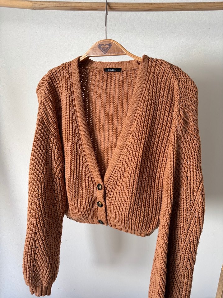 Az kullanıldı , tertemiz Kahverengi örgü hırka, bol kesim, uzun kollu ve V yakalıdır. Günlük kullanıma uygun rahat bohem stil sunar.