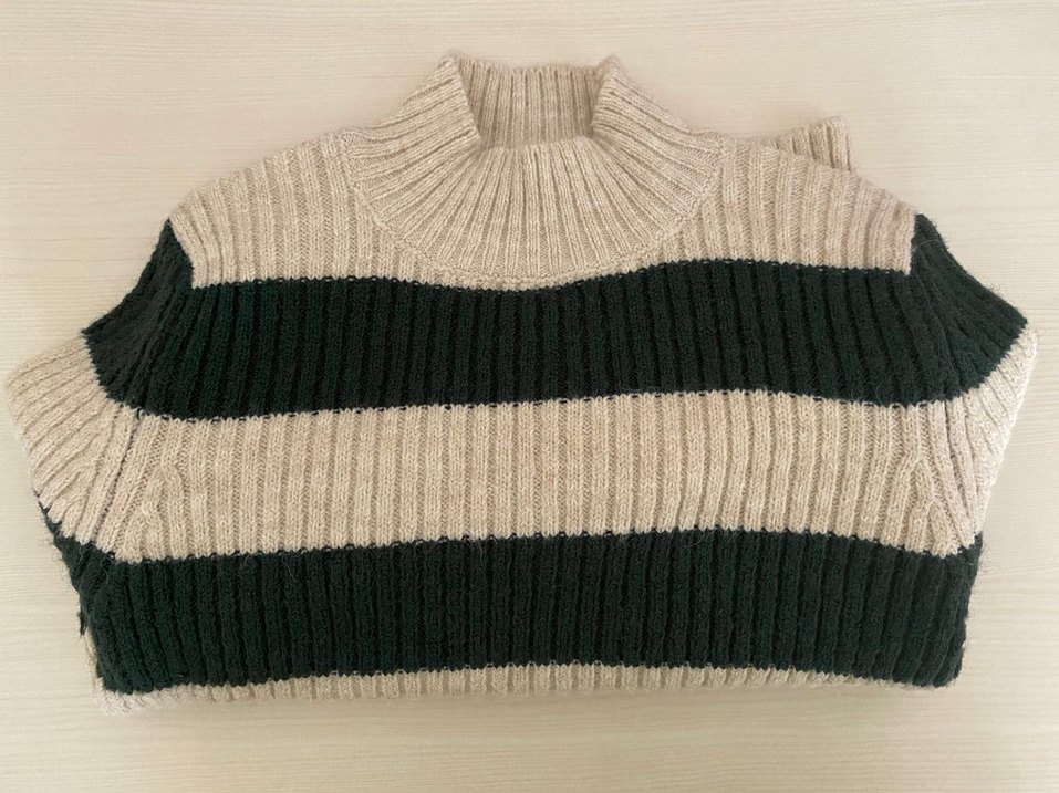 Fitilli ve boğazlı bu kadın kazağı, uzun kollu ve yeşil-gri çizgili örme kumaştan yapılmıştır. Günlük sokak stili için uygundur.