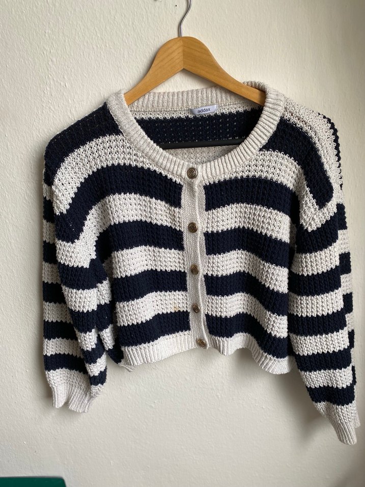 Uzun kollu, yuvarlak yaka, çizgili desenli siyah beyaz örgü kadın hırka. Rahat kesim. Temizdir