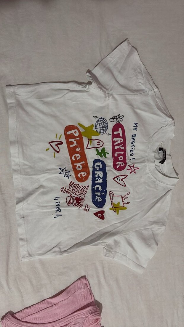 kısa kollu, yuvarlak yaka beyaz tişört. Renkli baskılı desenlerle rahat ve trend bir görünüm sunar.