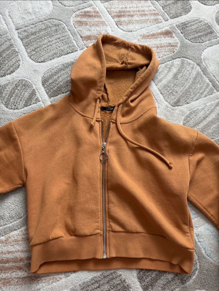 Kahverengi kapüşonlu, fermuarlı sweatshirt. Uzun kollu, bol kesim ve yumuşak, sıcak kumaştan üretilmiştir. Rahat sokak stili için uygundur.