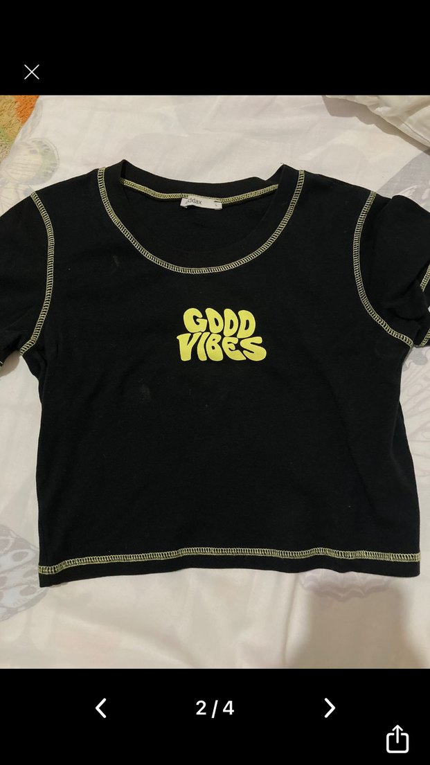 Siyah mini tişört, kısa kollu ve yuvarlak yaka tasarıma sahiptir. Kontrast dikiş detayları ve "Good Vibes" baskısı ile salaş bir görünüm sunar. Rahat ve şık bir tarz yaratır. ✨