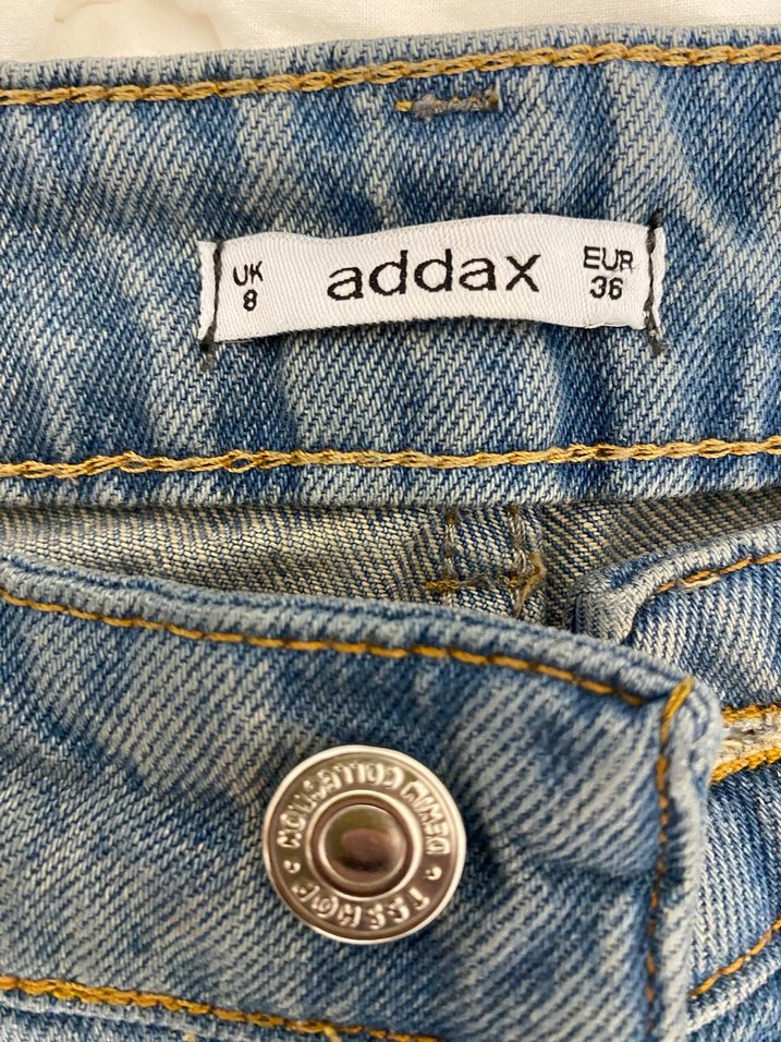 Addax marka mavi denim şort, düğmeli ve gevşek kesim. Baskılı detaylara sahip, sokak stiline uygun, günlük kullanıma uygun şort. Beden EUR 36.