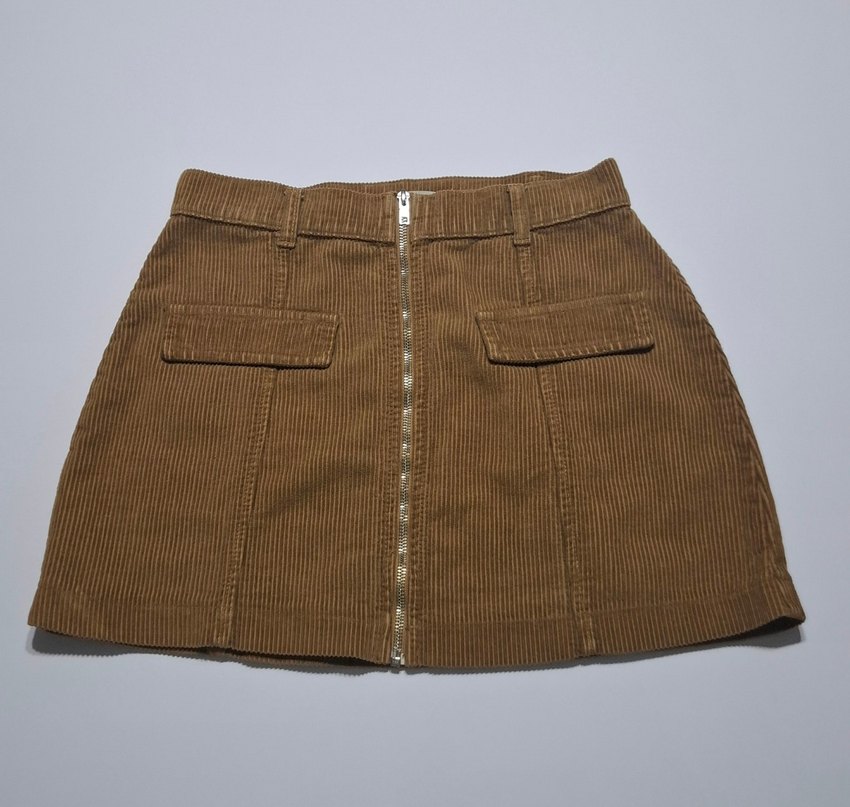 Bu kahverengi kadife mini etek, ön fermuar, günlük kullanım için şık ve rahat bir görünüm sunar.